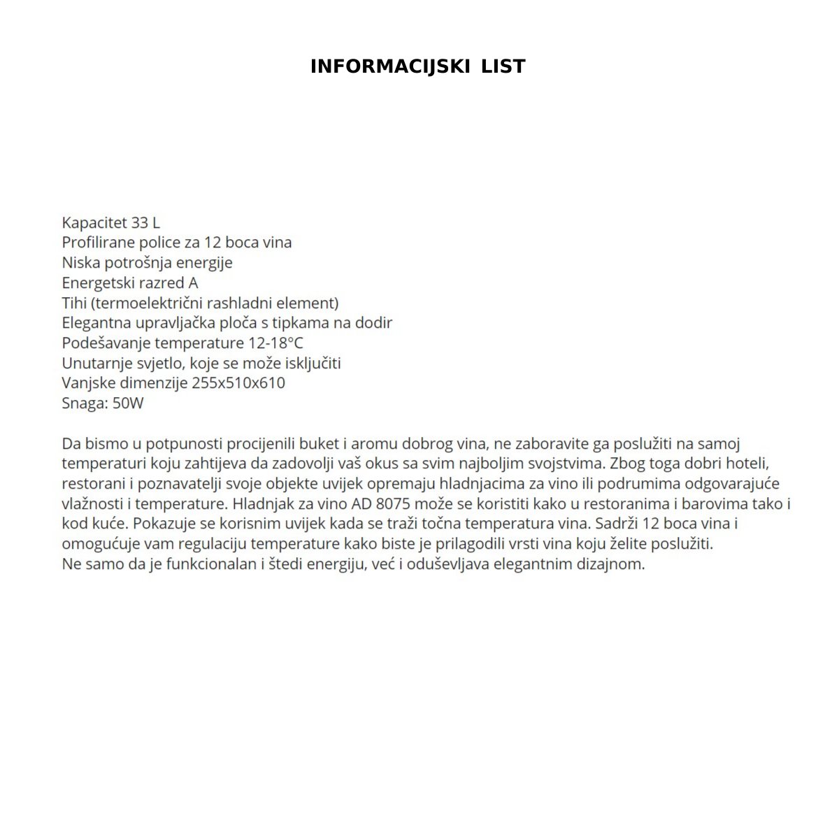 vlažnosti i temperature. Hladnjak za vino AD 8075 može se koristiti kako u restoranima i barovima tako i