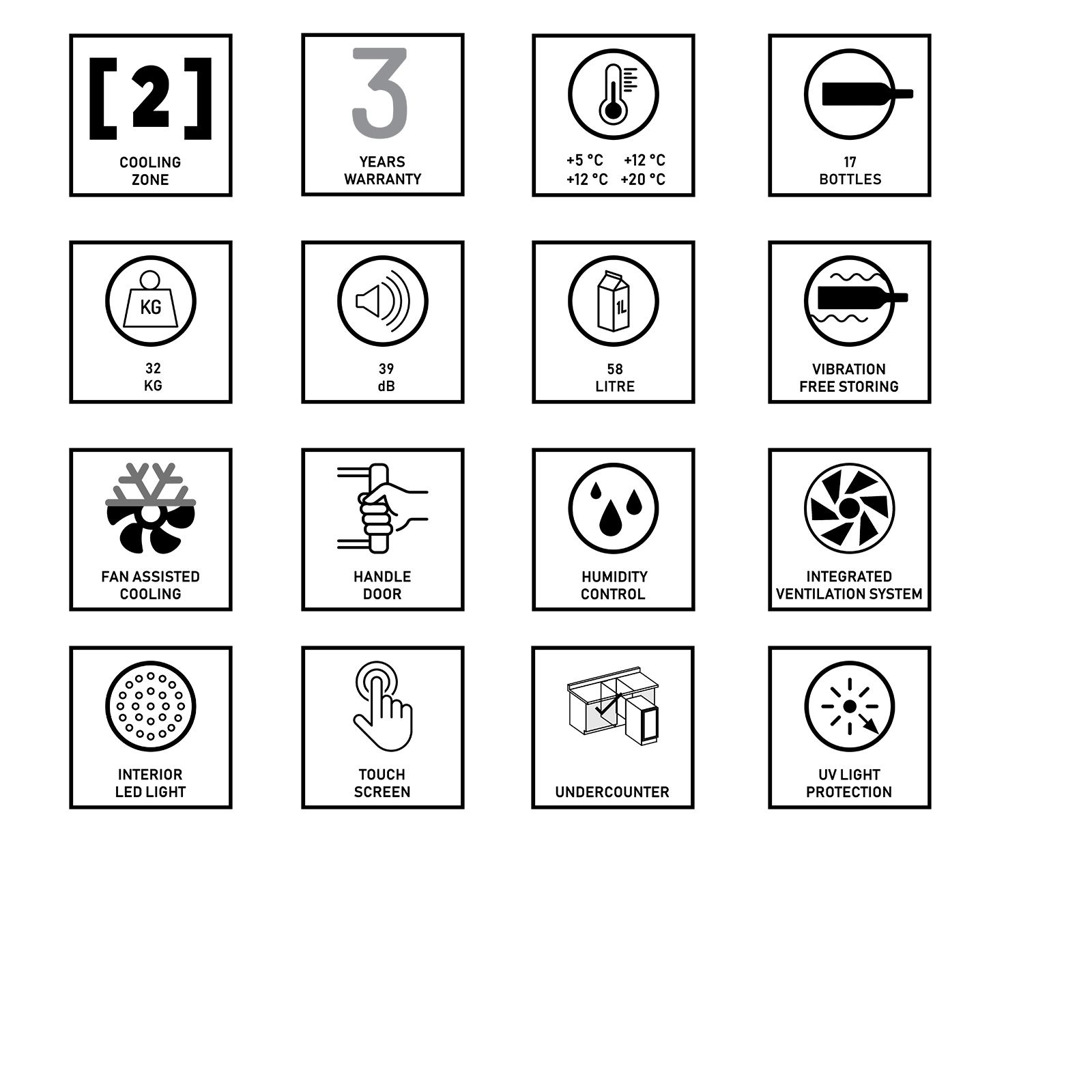 Hladnjak za vino ugradbeni podpultni s ručkom za 17 boca vina. Dvije komore za hlađenje, drvene police, zatamljena staklena vrata UV tretirana.