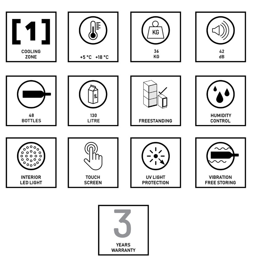 čuvanje. Ovaj model hladnjaka za vino ima kapacitet od 48 boca i ima jednu zonu hlađenja.